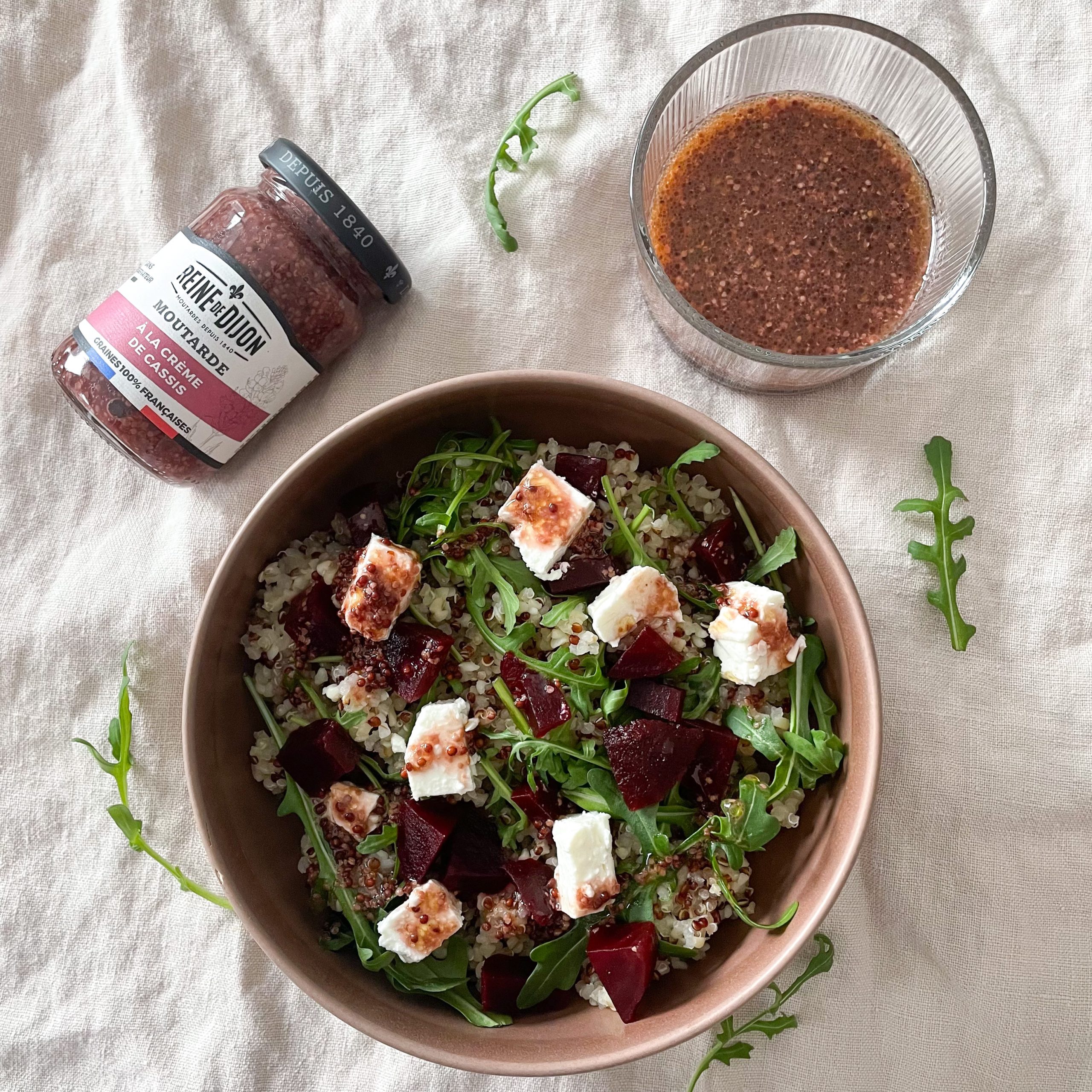 Étape 4: Composer la salade en ajoutant le quinoa, les cubes de betteraves et de feta, quelques feuilles de roquettes puis verser la vinaigrette