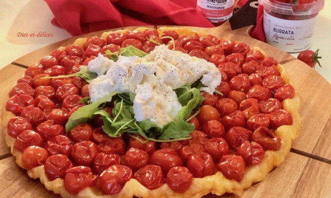Laver et essorer la roquette. La dresser au centre de la tarte tatin puis déposer dessus la burrata.